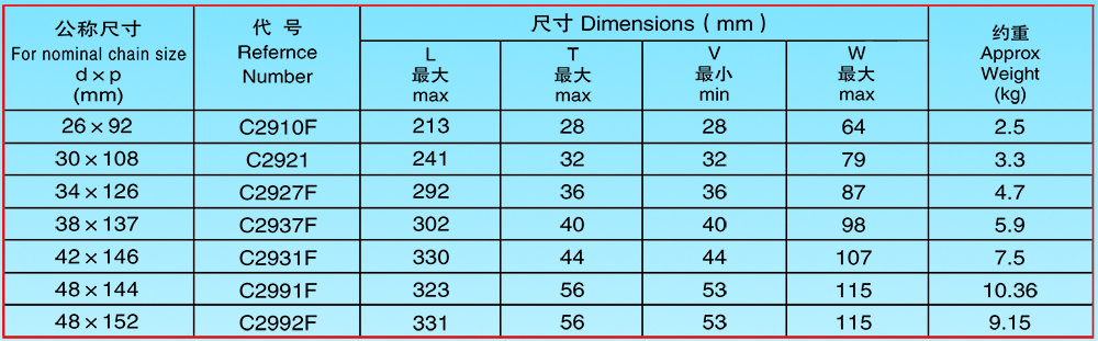 這種接鏈環(huán)只可處置使用,其外形大小符合DIN22258 Part3 標(biāo)準(zhǔn)要求,并經(jīng)精心設(shè)計(jì),以確保與配套鏈輪的配合。由于采用較低寬度設(shè)計(jì),在同樣大小的傳送槽中,可采用較大截面鏈環(huán),從而提高輸送能力。