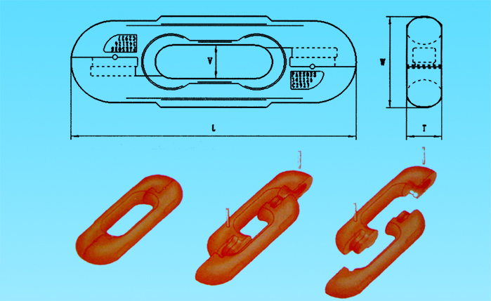 這種接鏈環(huán)只可垂直使用,其外形大小符合DIN 22258 part 3標(biāo)準(zhǔn)要求,并經(jīng)過精心設(shè)計(jì),以確保與配套鏈輪的配合。 “V型鎖”接鏈環(huán)的重量比其它類型接鏈環(huán)較輕。V型鎖式接鏈環(huán)裝配一定要注意裝配方向,保證箭頭方向與傳動(dòng)方向一致。